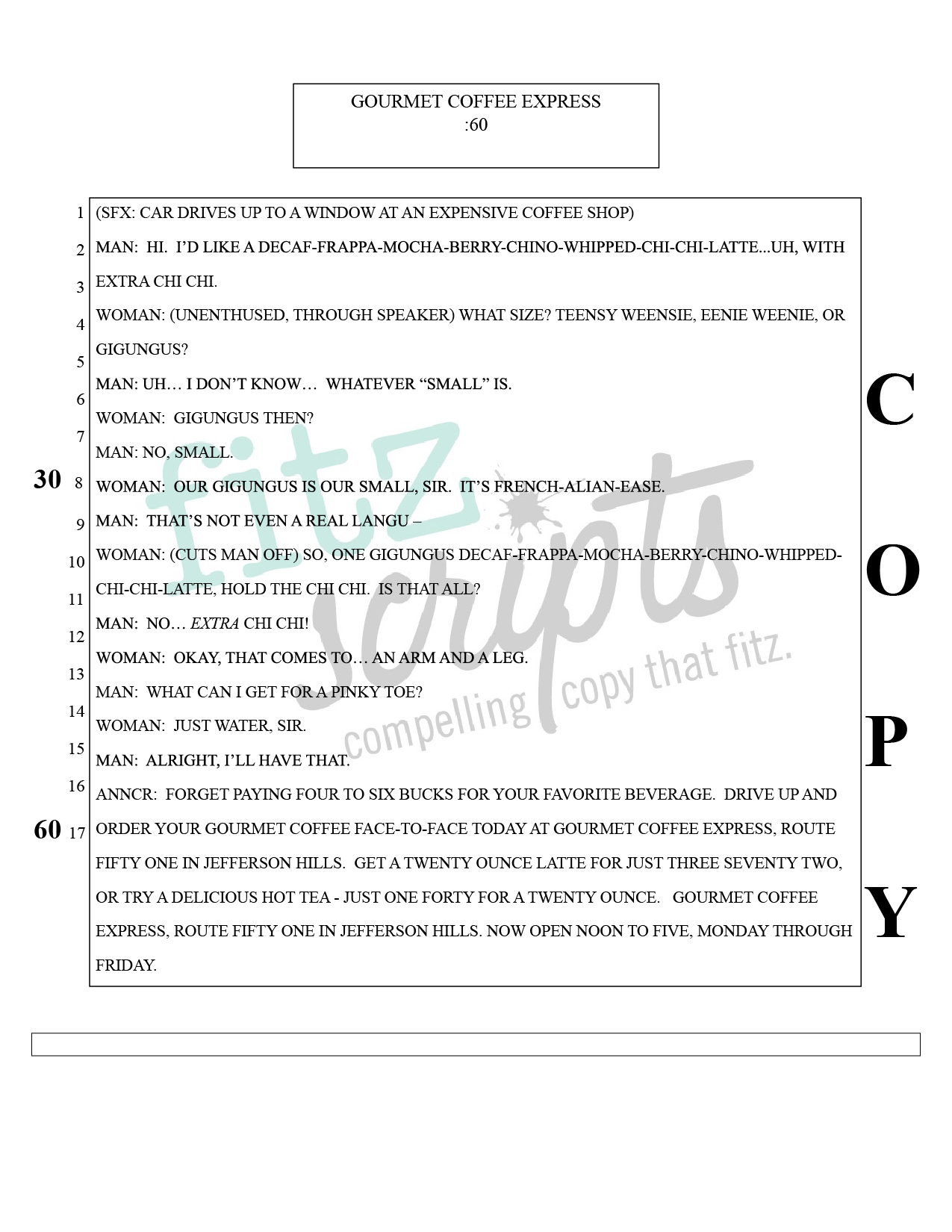 FitzScripts provided copywriting and marketing concepts for the Gourmet Coffee Express radio spot.